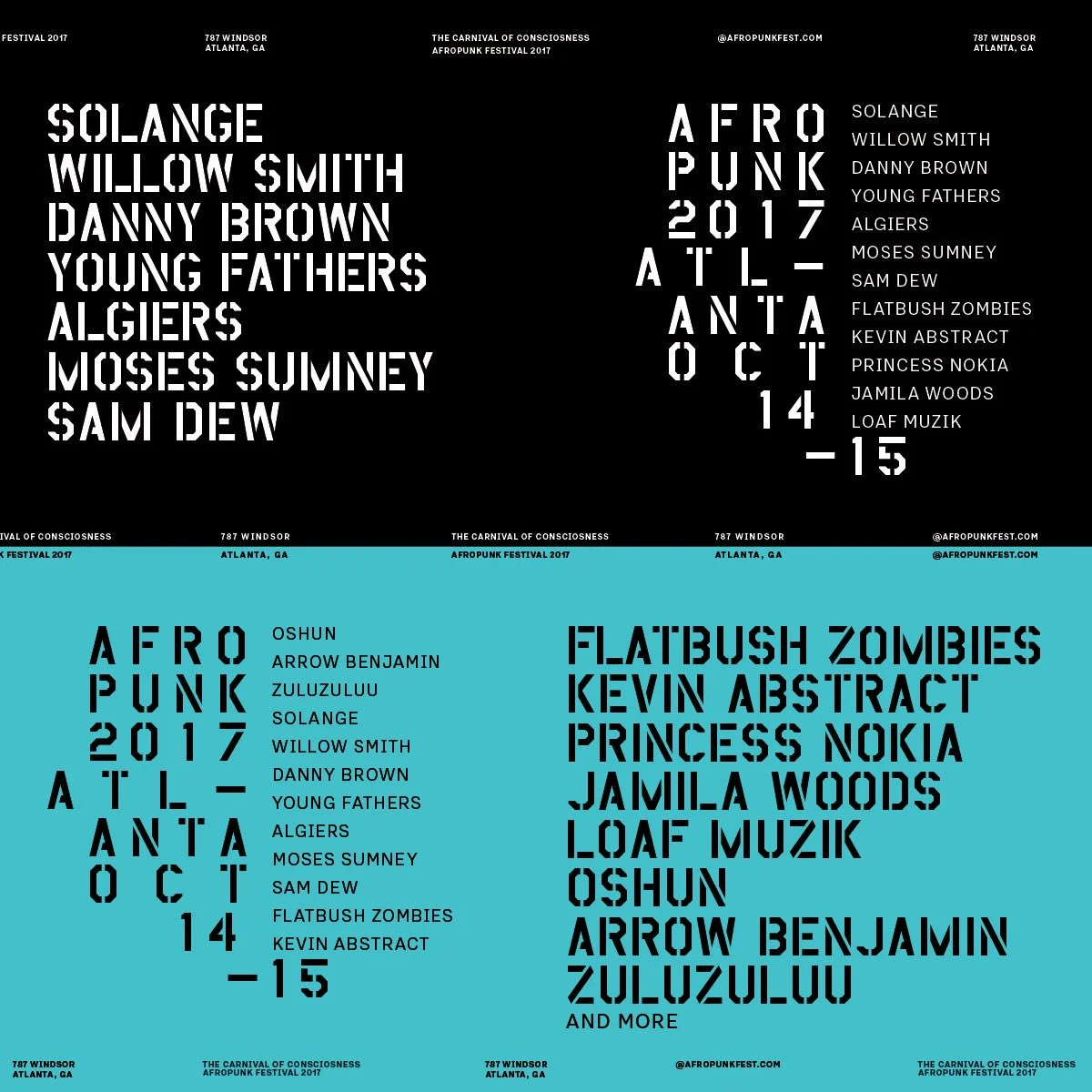 Afro-Punk Atlanta welcomes Solange, Willow Smith, Danny Brown, Young Fathers., Algiers, Moses Sumney, ZULUZULUU, Kevin Abstract, Flatbush Zomies, Jamila Woods, Oshun & many more.